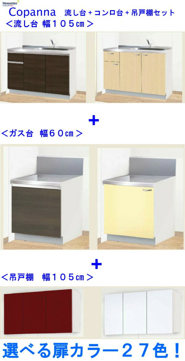 ハウステック 流し台(105センチ)+コンロ台(60センチ)+吊戸棚(105センチ)セット シンク W1650 幅165センチ 送料無料 キッチン 豊富な扉カラー27色 おしゃれ